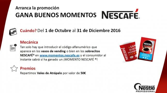 Arranca la promoción GANA BUENOS MOMENTOS NESCAFÉ® entre los consumidores de NESCAFÉ® en máquinas vending ¡y ahora también entre los consumidores de NESCAFÉ® SOBRE en el bar!